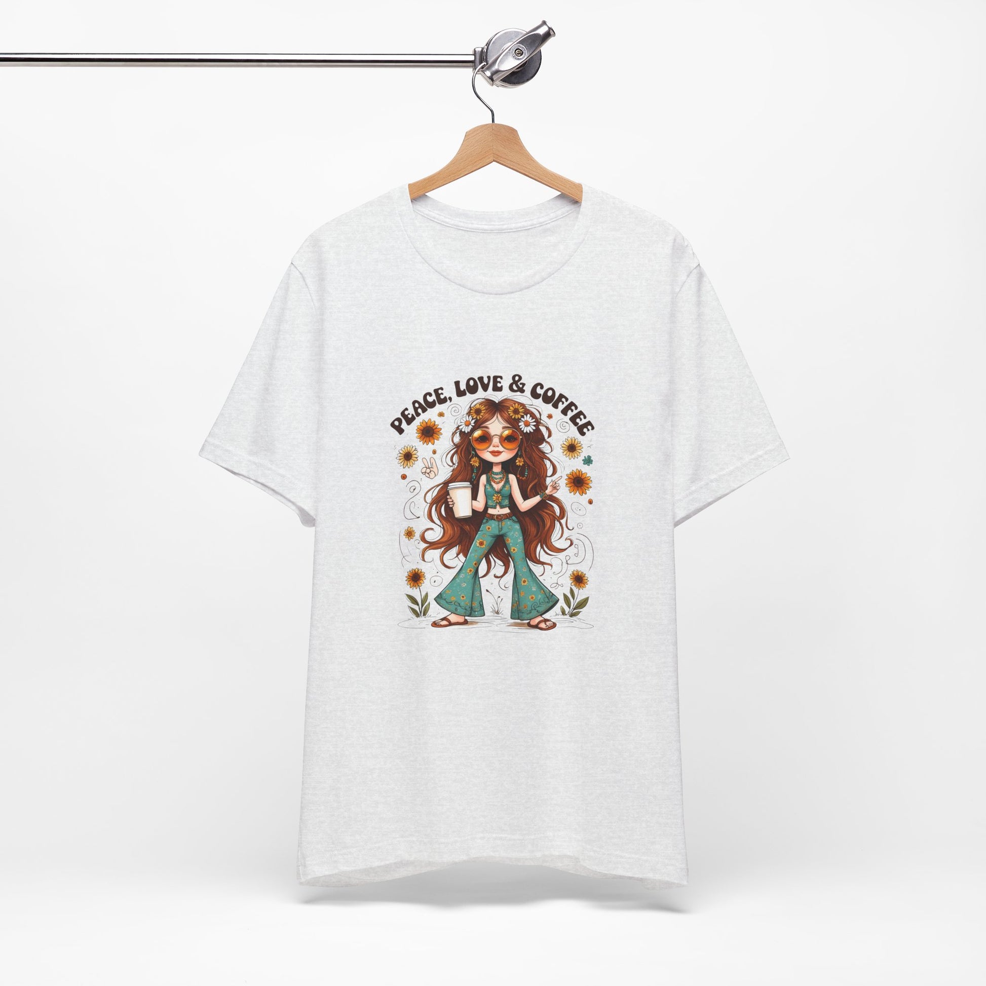 Introducing a casual yet stylish Unisex Jersey Short Sleeve Tee that effortlessly blends comfort with a touch of whimsy. This tee is perfect for expressing your love for peace, love, and of course, coffee! It’s designed for those who appreciate a laid-back aesthetic while enjoying life’s simple pleasures. The relaxed fit makes it a versatile addition to your wardrobe, suitable for casual outings, coffee dates, or cozy days at home. Ideal for young adults and coffee enthusiasts, this tee embraces a carefree, bohemian vibe that celebrates individuality and self-expression. Celebrate occasions like Earth Day, International Coffee Day, or just those lazy Sundays with this delightful tee that adds a splash of fun to any outfit.